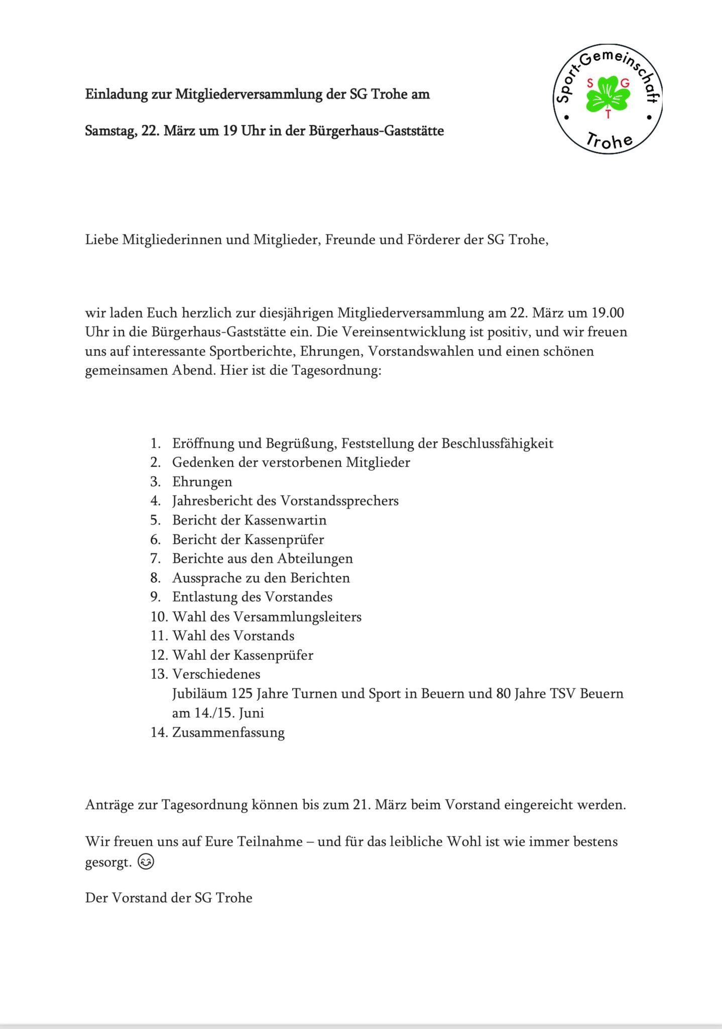 Liebe Mitglieder und Freunde der SG Trohe, wir möchten euch darüber informieren, dass die Aktivitäten der Wanderabteilung vorerst eingestellt werden. Leider war die Resonanz in letzter Zeit sehr gering, und auch aus zeitlichen Gründen ist eine regelmäßige Durchführung derzeit nicht möglich. Wir bedanken uns herzlich bei allen, die sich in der Vergangenheit engagiert und teilgenommen haben, und hoffen, dass wir zu einem späteren Zeitpunkt eventuell nochmal einen neuen Anlauf starten können. Mit sportlichen Grüßen Eure SG Trohe